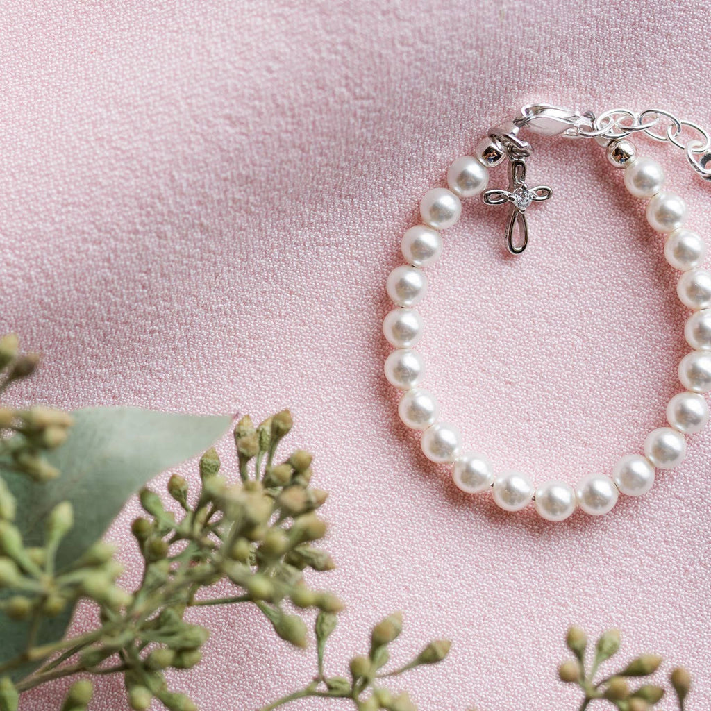 Beautiful keepsake sterling silver bracelet with soft white high-end Austrian simulated pearls and a silver infinity cross charm - perfect for baptisms, christenings, and holy first communion! Each bracelet has an extension chain, as the child grows just move to the next link for a perfect fit. This bracelet is available in three sizes and is great for infants, babies, toddlers, and older girls. This cross bracelet comes in a beautiful gift box and will be a keepsake she will cherish Forever. Made in the USA