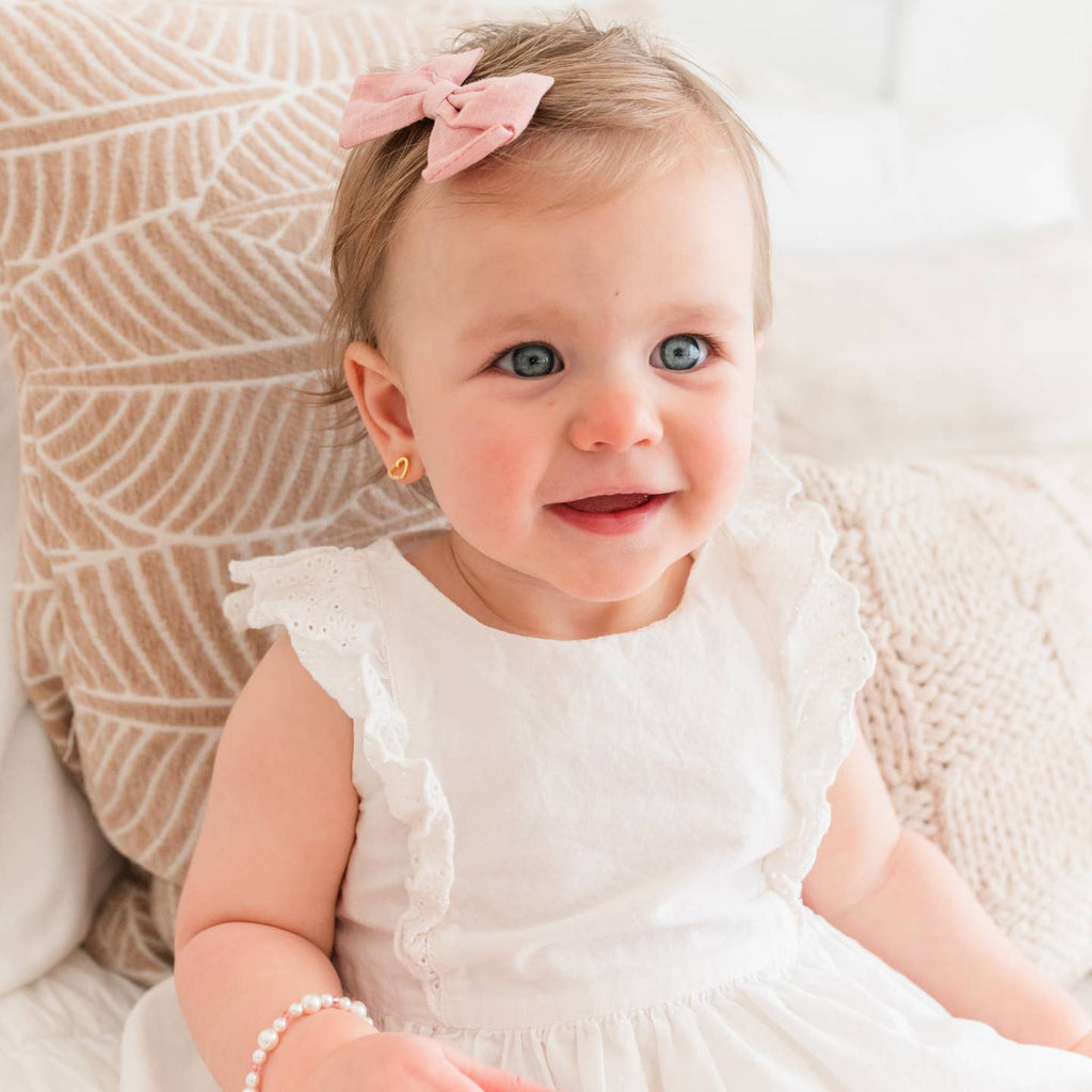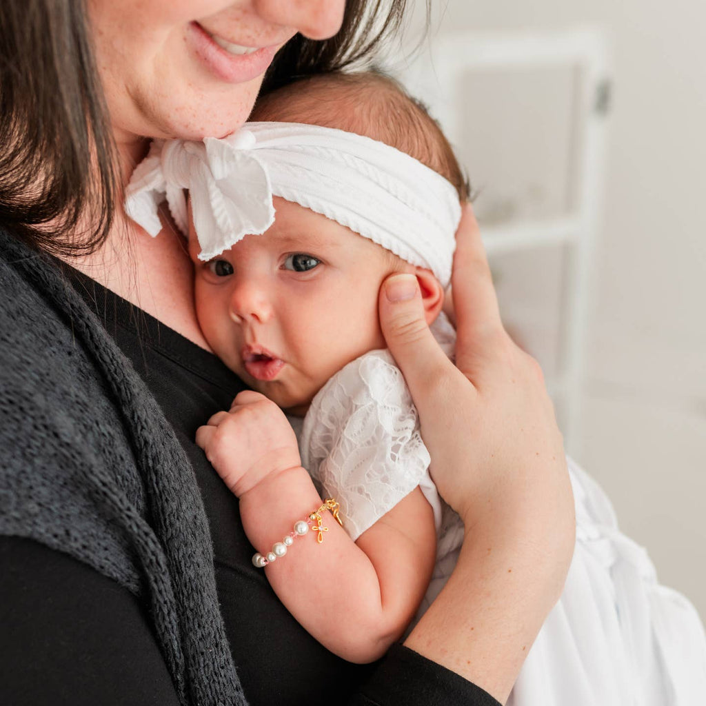 Add a touch of elegance to your little one's look with this gorgeous 14K gold plated pearl cross bracelet, handmade with love in the USA.