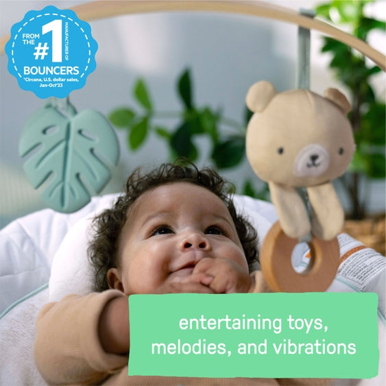 Keep baby entertained and safely seated without compromising your chic home décor with the Ingenuity Cozy Spot Soothing Baby Bouncer. The sustainably harvested birch wood toy bar features 2 removable toys and premium, ultra-plush materials to give baby a soothing space all their own. Toys include a Nate the Bear plush toy with a natural wood ring and a silicone leaf-shaped toy. Soothing melodies keep baby engaged, and the bouncer features volume control and auto-shutoff to let parents remain in control of the sounds. (Batteries not included). Equipped with removable head support and a 3-point harness, Cozy Spot offers a comfy, safe space for baby. The seat pad is machine-washable, and toys easily wipe clean. Featuring a soft, gender-neutral color palette, Cozy Spot makes for the perfect baby shower gift crafted for ages 0-6 months.