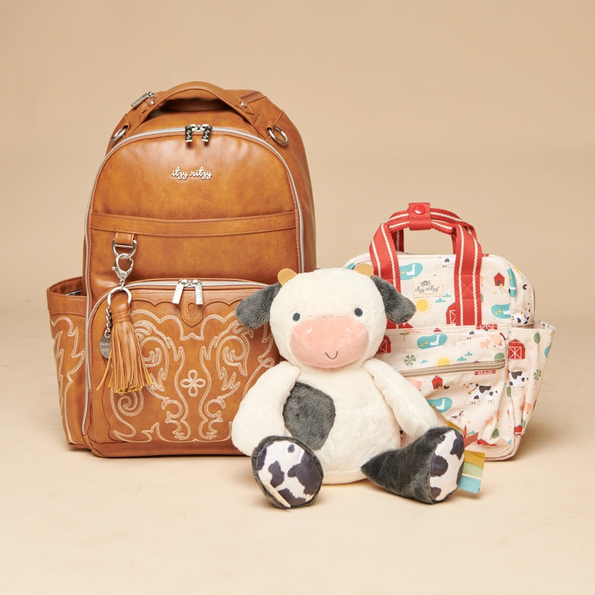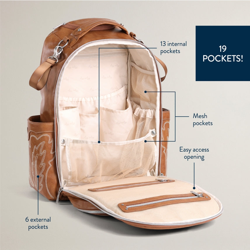 Features - Removable vegan leather accent tassel - Tons of interior and exterior pockets, 19 total pockets (13 internal and 6 external including 2 large insulated bottle pockets) and a unique, easy access front mom pocket with 3 interior pockets and key lanyard. Laptop pocket – fits up to a 15” laptop. Zippered tall front external pocket - Coordinating easy wipe changing pad included with whimsical "head" and "toes" printed on the inside. - Itzy Ritzy Logo and Braid Rubber Foot design - Includes coordinating stroller straps