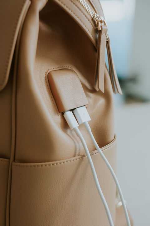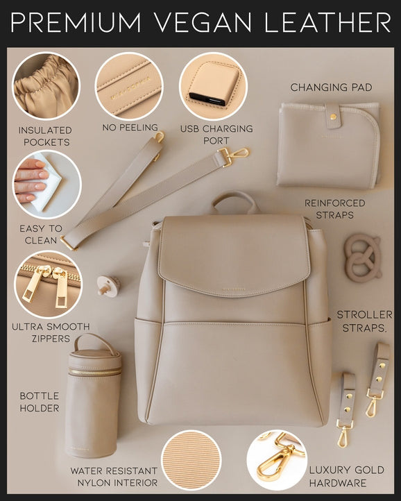 The Olivia features: * 100% wipeable and spill resistant interior and exterior * Large capacity with 5 exterior and 10 interior pockets with a spacious interior to hold larger items * USB charging port allows for convenient charging while on the go * Dedicated pocket to hold a laptop or tablet * Luggage Sleeve * 6 insulated pockets to help keep beverages at their optimal temperature * Carry as a backpack, purse, crossbody or top handle * Key leash