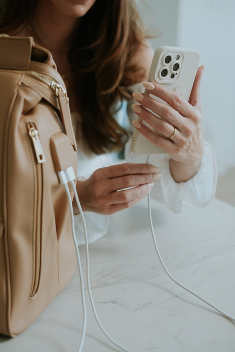 The Sophia features: * 100% wipeable and spill resistant interior and exterior * Large capacity with 5 exterior and 10 interior pockets with a spacious interior to hold larger items * USB charging port allows for convenient charging while on the go * Dedicated pocket to hold a laptop or tablet * Luggage Sleeve * 6 insulated pockets to help keep beverages at their optimal temperature * Carry as a backpack, purse, crossbody or top handle * Key leash
