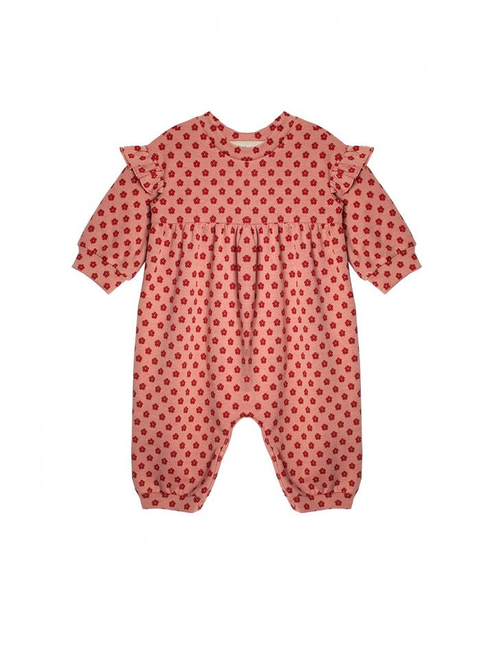 This charming romper features an empire waistline and ruffle accents at the shoulders, creating a sweet, timeless look. Perfect for special occasions or holiday photo ops, it combines both elegance and playfulness.