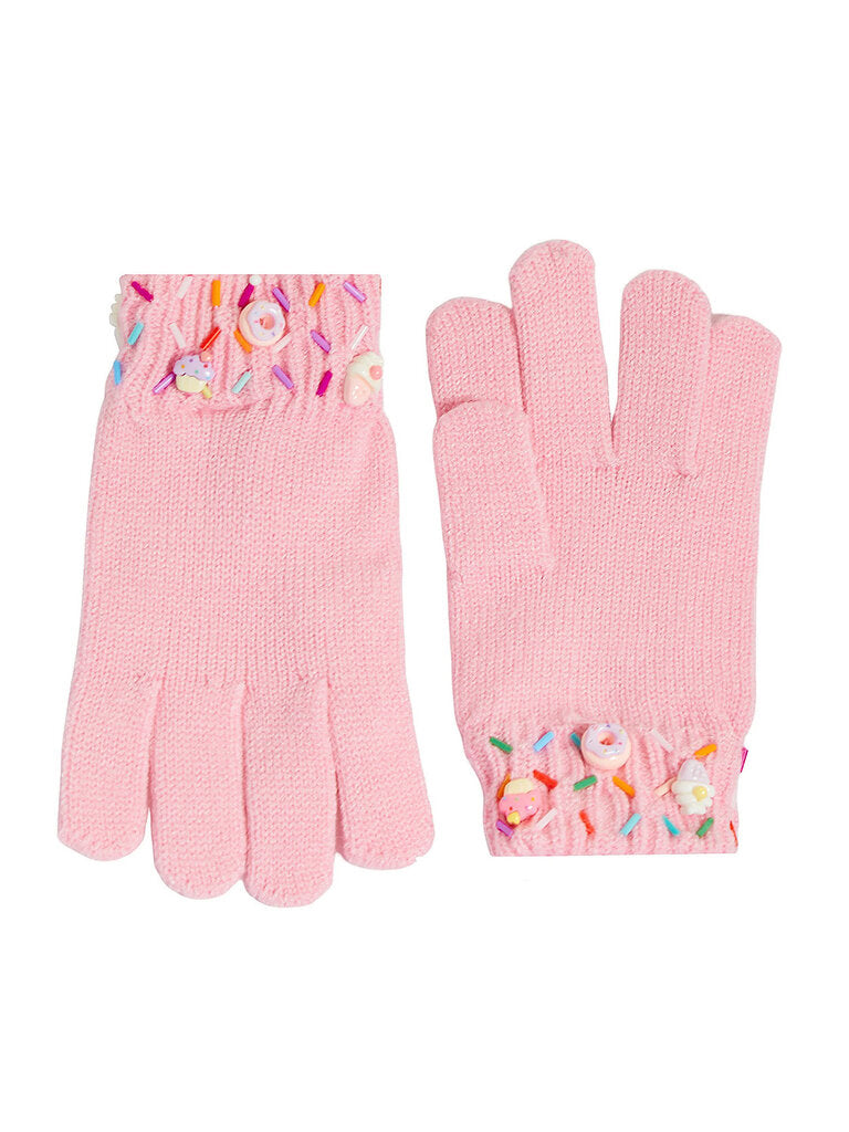 Bari Lynn charm gloves decorated with colorful sprinkles and treat charms. Ribbed cuffs. One size fits most