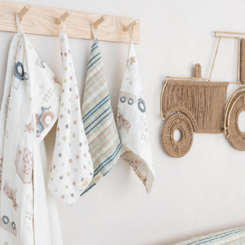 Wrap your baby in countryside comfort with this 2-piece muslin swaddle set. One blanket features a playful tractor and farmhouse print while the other offers a timeless dot pattern, both in soft, earthy hues. Made from 100% cotton muslin, these breathable blankets are perfect for swaddling, nursing, stroller rides, or snuggles at home. A charming and practical gift for any new parent.