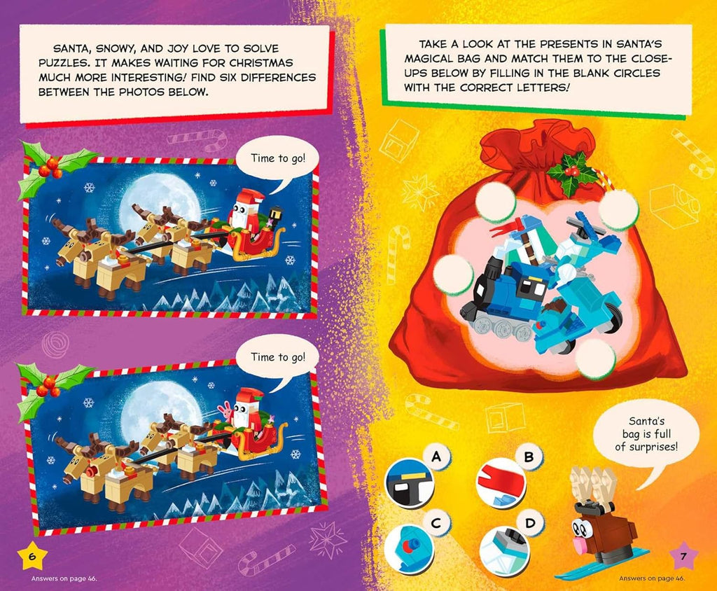 Get into the holiday spirit with this LEGO(R) activity box! This Christmas kit comes with a super-fun activity book, stickers, and LEGO elements. Use the included elements to build three exclusive characters—a Santa Claus, a snowman, and a reindeer. The rebuild! and build me! sections will help you build accessories for your characters while you tackle mazes, puzzles, and craft activities. Then read about their adventures in the funny comics. With more than 65 stickers and so much to build, read, rebuild, and imagine, this LEGO Christmas kit will be the perfect addition to the festive season!