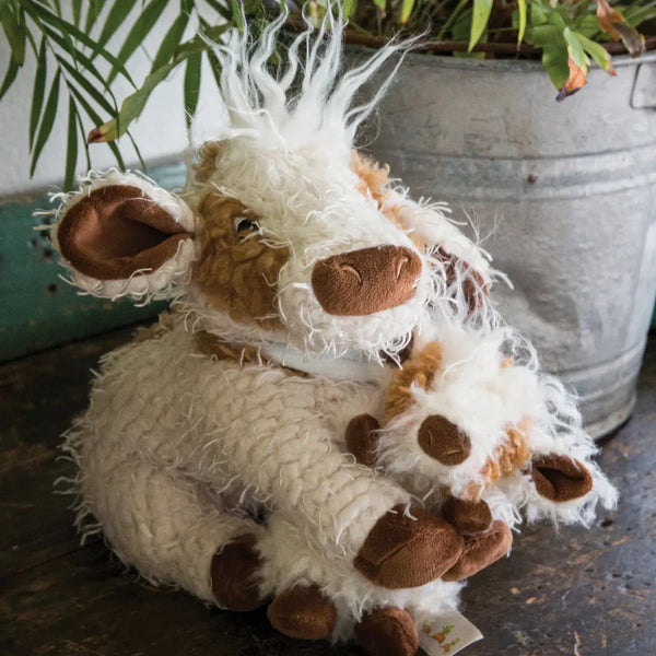 A sweet set indeed, Moo Moo and baby Half Calf are the perfect pair! Moo Moo has shaggy fur in cream and mocha brown with soft velour features, embroidered face, a cute bandana and a fun tuft of white fur upon his head.