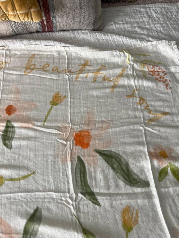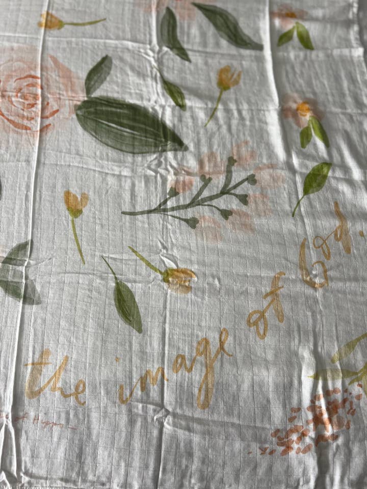 The muslin swaddle blankets measure 47”x47”. This “Beautiful Soul” design swaddle was inspired by a vintage bedspread the creator owned as a child. The St. Augustine quote, “know then o beautiful soul that you are the image of God” is the message that every small child and inner child needs to hear and know to be true.