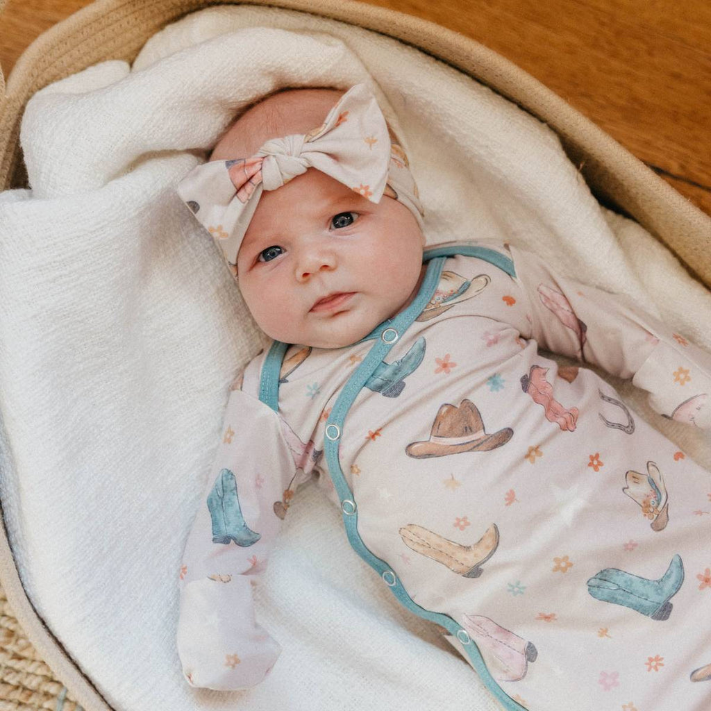 Knot your average baby gown. Made with the same premium knit fabric as our beloved swaddles, this soft and stretchy gown ties at the bottom for easy diaper changes, and room to grow. Available in your favorite Copper Pearl prints, it features unique snaps to make dressing a breeze, along with fold-over hand mitts to prevent scratching. Sure to be baby's favorite outfit!