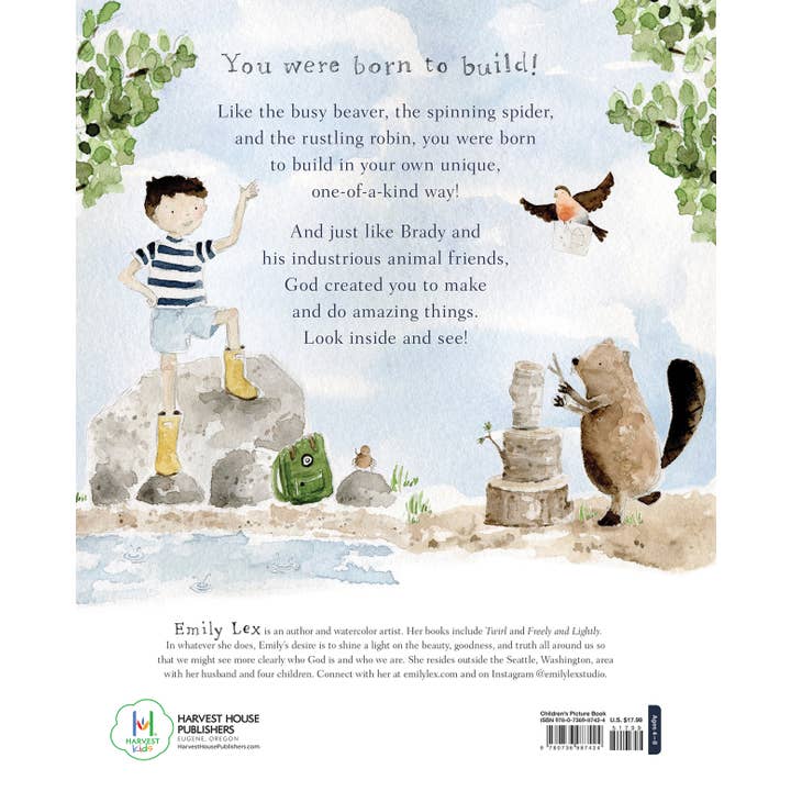 Day after day, amazing ideas flashed into his mind. They zipped and zapped from his head to his hands as he built his newest creation. Yes, Brady boy loved to build.” We are each a masterpiece designed by God to reflect His image in our own one-of-a-kind, never-ever-to-be-duplicated way. Help your children celebrate their specialness as you share this charming tale about a boy who discovers the truth of who God made him to be, with a little help from his animal friends—some of nature’s master builders. Featuring original writing and watercolors from popular author and artist Emily Lex, Build will become a family reading time favorite and spark important conversations with your children about their unique place in God’s creation.