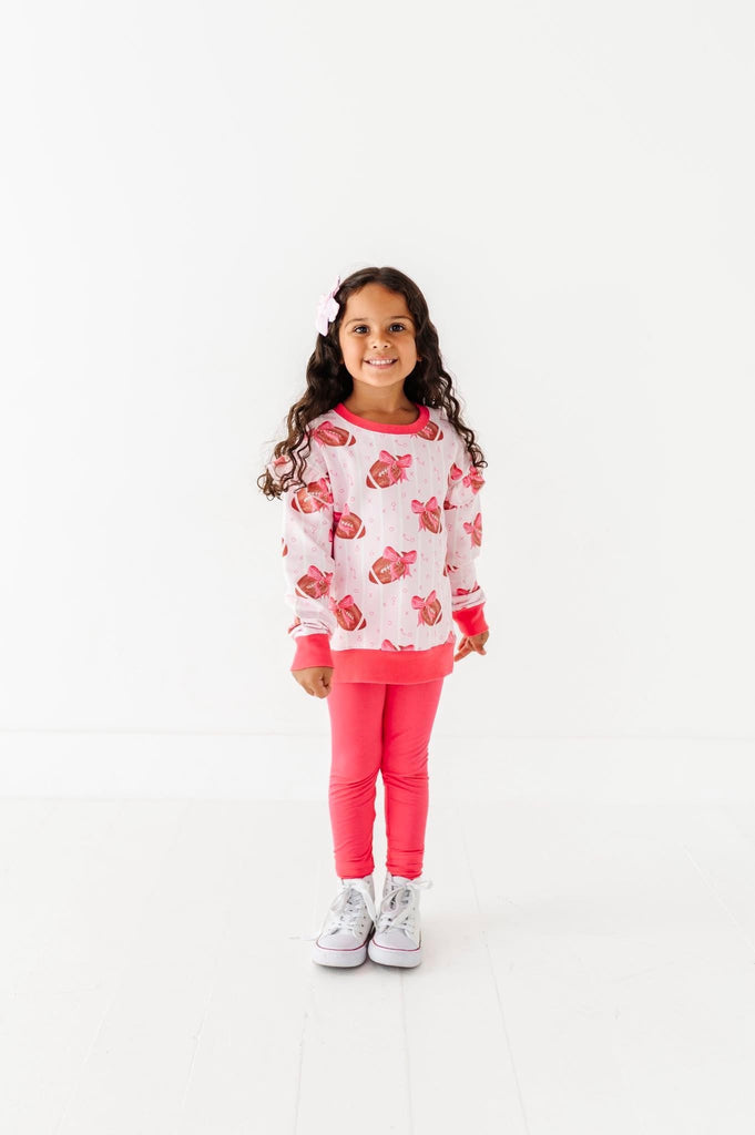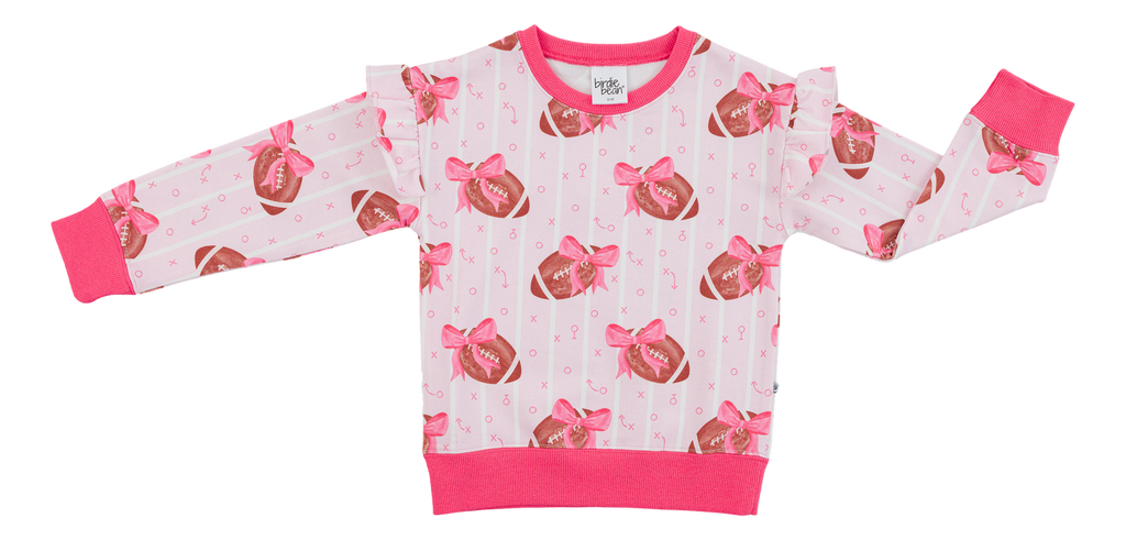 Cozy, cute, and ready for game day. This pullover is covered in our fan-favorite football-with-bows print with pop of pink trim—perfect for little cheer captains and sideline snack pros. Easy to throw on for school, practice, or stadium seats, and adorable with leggings, joggers, or jeans.