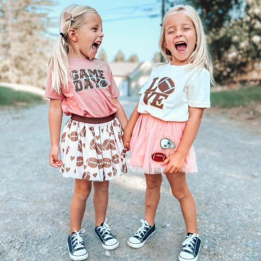 The Football Love Patch Short Sleeve T-Shirt is a fun and cute t-shirt for kids celebrating Game Day!