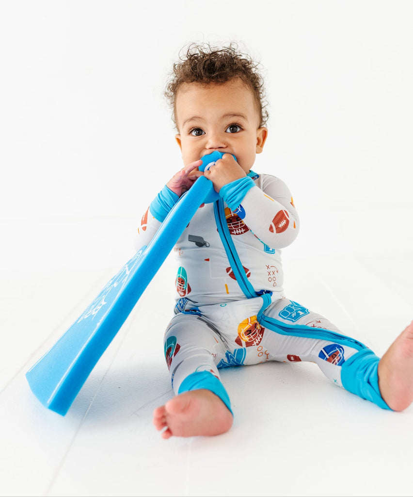 Romper or footie? Yes. Our fold-over feet cuffs flip this romper from playtime to snooze time in seconds, and the 2-way zipper makes diaper changes a quick drive down the field. Printed on our signature buttery-soft bamboo blend with just-right stretch.