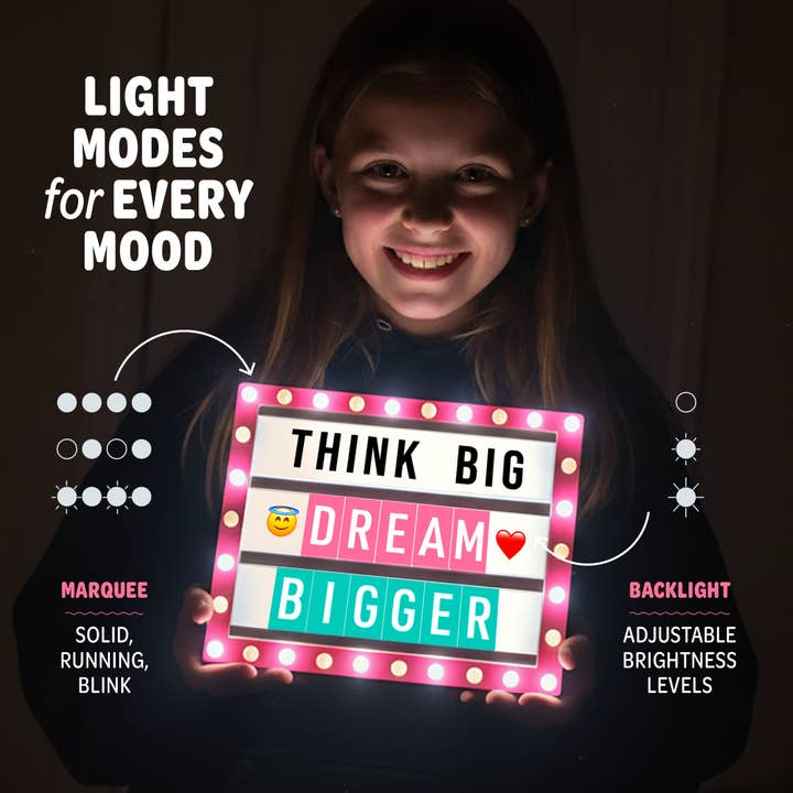 - MAKE YOUR MESSAGE SHINE: Bring words to life with the rechargeable cinema light box that glows with style. With 350+ letters, emoji, and blank tiles; running marquee lights; and an adjustable backlight, it’s your ultimate board for creativity and expression.