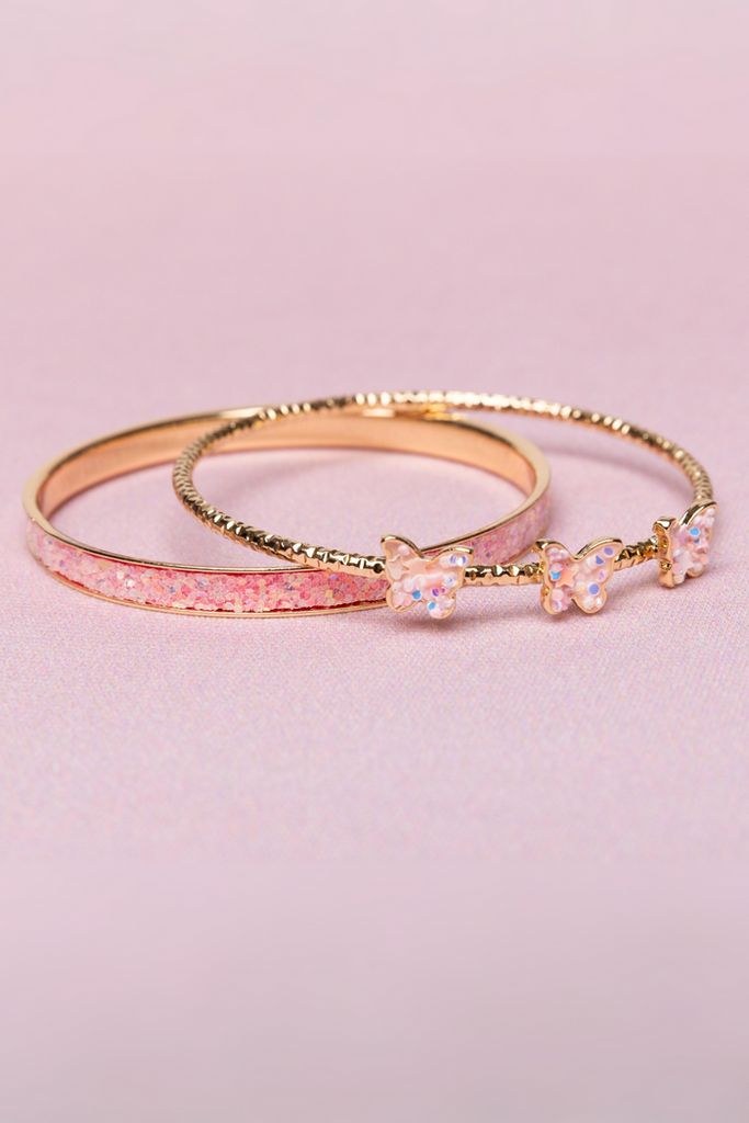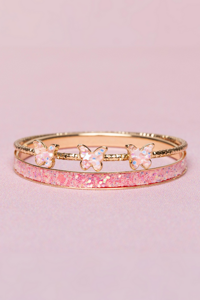 Elevate your style with our Boutique Chic Butterfly Bangles, featuring a stunning combination of a beautiful pink glittery bracelet and a delicate thin gold bracelet adorned with three charming pink butterflies.