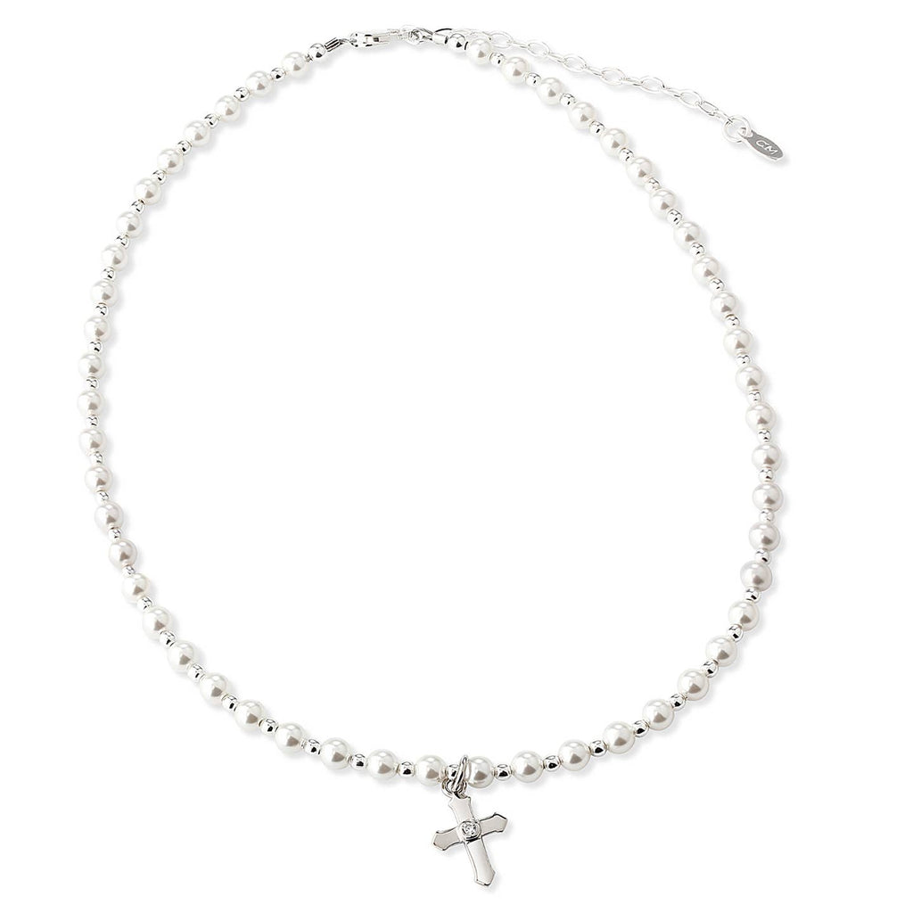 Children's sterling silver beaded necklace with high-end Austrian simulated pearls and dainty silver cross charm.