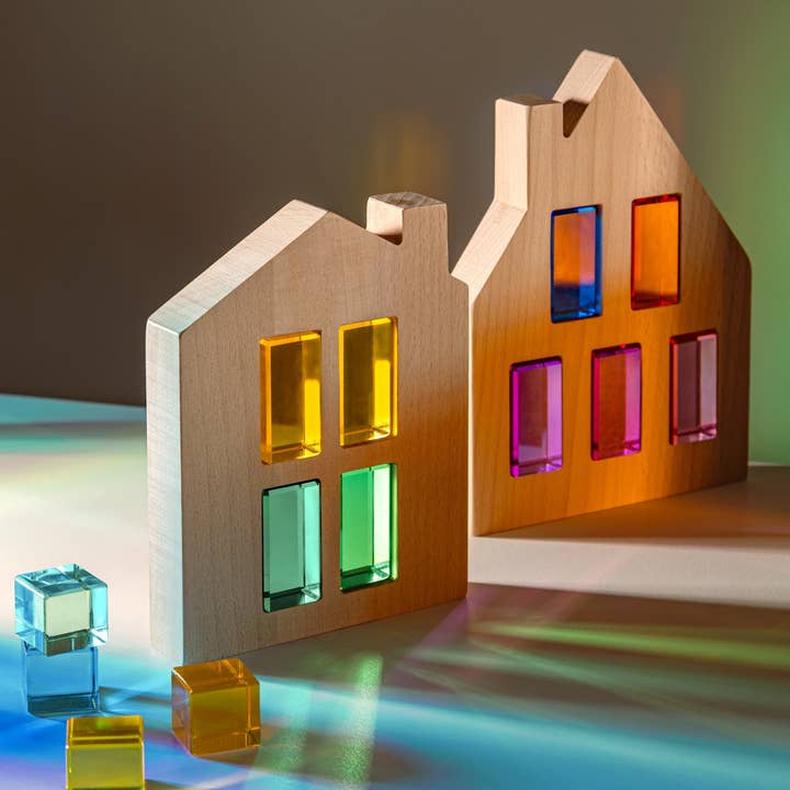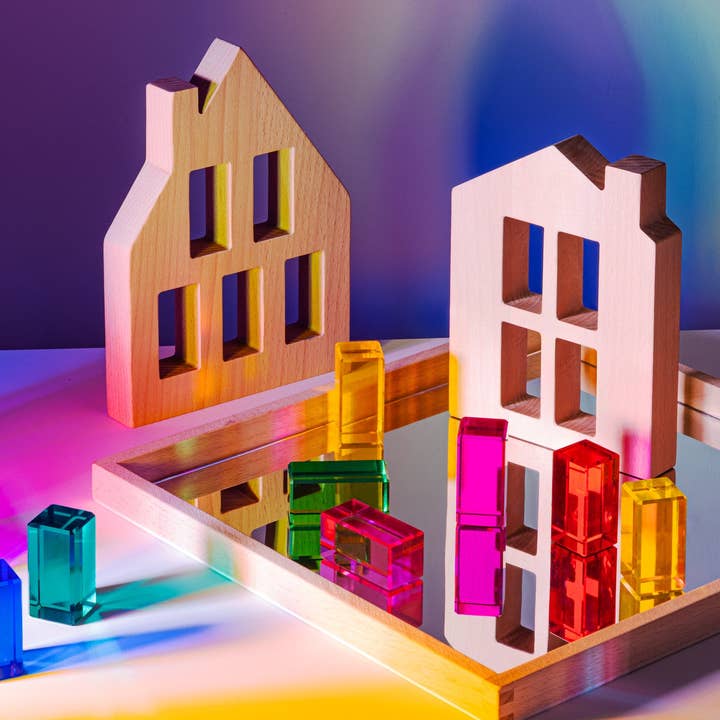 With their radiant acrylic windows set in smooth natural wood, Remi Blocks are perfect for stacking, building, color matching, light play, and loose parts exploration. Whether used on their own or alongside the Riley Blocks, they inspire creativity, fine motor development, STEM concepts, and imaginative play. Place them near a window or add a flashlight, and watch as light passes through to create magical shadows and glowing reflections.