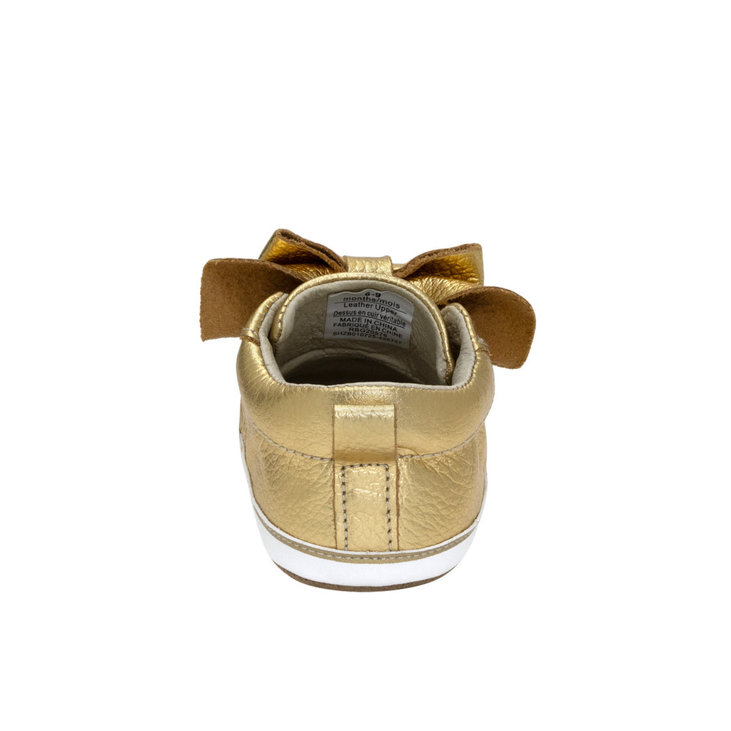 The Aria First Kicks in Yellow Gold are the perfect blend of elegance and fun. Made from metallic yellow gold leather with tonal stitching and a gold bow, these pre-walker shoes are ideal for any occasion. The lightweight sole and slip-proof bottom promote healthy foot development, making them perfect for babies, pre-walkers, and toddlers.