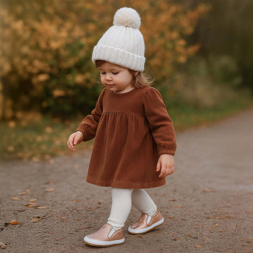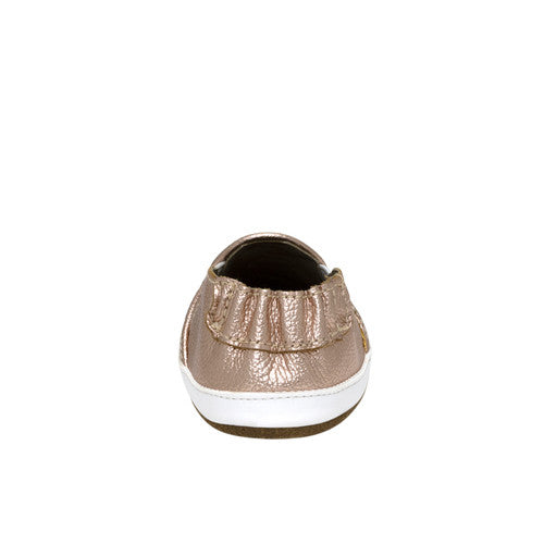 The Leah Basic Soft Soles in Gold add a subtle touch of shimmer to your little one’s everyday look. Crafted with a genuine leather upper in a warm rose gold tone and a soft suede outsole, these shoes provide the perfect blend of style and comfort. Designed with a roomy fit to support natural foot growth and a flexible sole for gentle grip, they’re ideal for early walkers ready to shine.