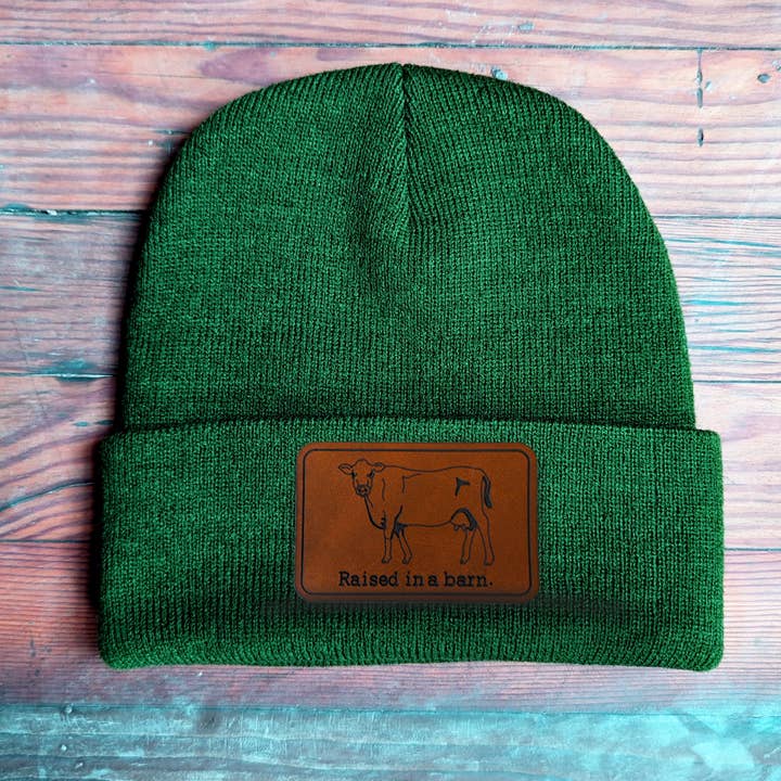 This super soft beanie comes in four appealing colors: Heather Grey, Black, Green, and Caramel, ensuring a snug fit for all ages with its one-size-fits-all design. It features a special vegan leather patch with the silly message "raised in a barn" for the most fun-spirited country kid.