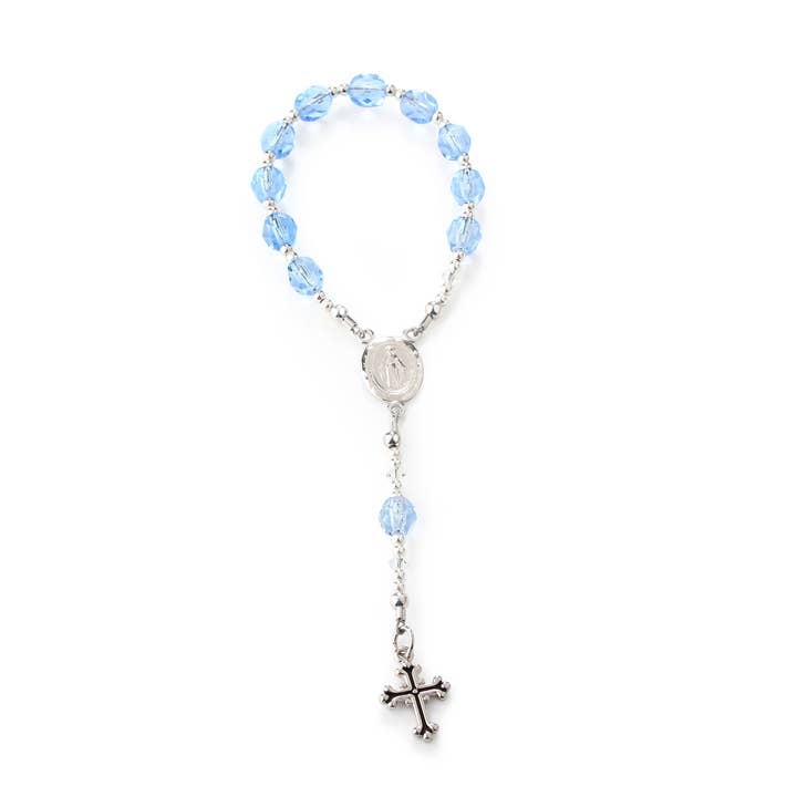This precious baby rosary makes a special baptism keepsake gift designed with sterling silver and beautiful blue fire polished beads. This features a miraculous medal and cross charm and is packaged as a special keepsake. Celebrate these cherished moments with this keepsake they will treasure forever!