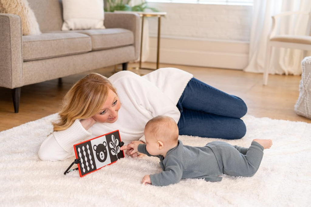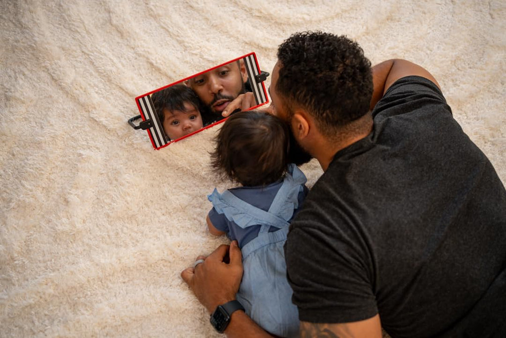Self-discovery and engaging graphics combined into one extraordinary tummy-time toy! The Discovery Mirror’s unique rectangle design allows for full-body reflection – a great introduction to depth perception and self-awareness. The reverse side features high-contrast black-and-white graphics supporting baby’s developing ability to focus. The mirror stand rotates 360 degrees so you can easily adjust the angle for seated or tummy-time play. Stand features two anti-slip beads so the Discovery Mirror stays propped as desired.
