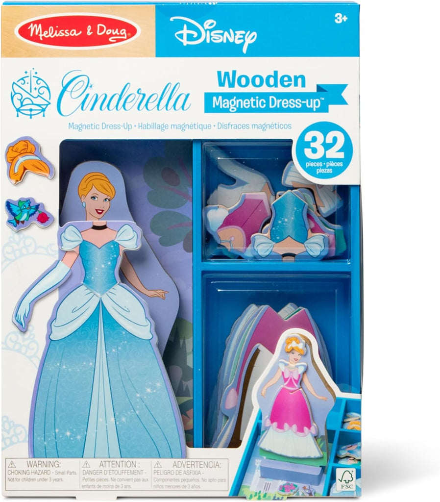 Mix and match 30 clothing and accessory pieces to tell the tale of Disney Princess Cinderella - or create your own fashion story! The wooden magnetic Cinderella doll fits into a wooden stand for pretend play. With sturdy wooden pieces in coordinating designs, there are countless combinations to create and tales to tell. The doll, stand, and pieces all store in a sturdy wooden tray. This unique dress-up doll helps kids three and older develop hand-eye coordination and fine motor, counting, and sorting skills, and encourages creative expression and imaginative play.