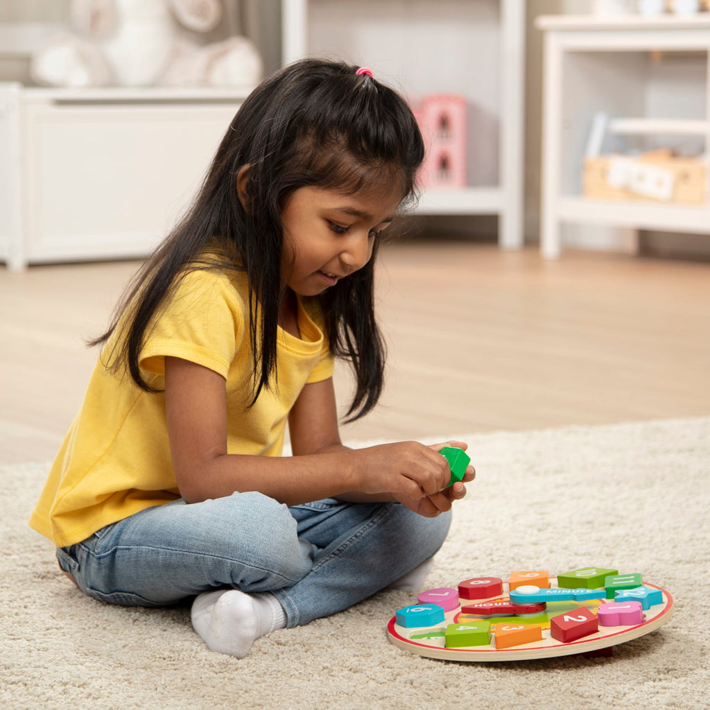 Our popular preschool-friendly clock gets a cool update! A larger face, exposed natural wood, and pops of vibrant color on match-able chunky pieces make for a fresh modern look . . . but the classic play value and top-quality construction remains the same. Kids love the color-coded minute and hour hands that spin around with a simple push. (No matter where they point, it's always time for learning and fun!) Children can match the colors, sort the shapes, and solve the puzzle as they manipulate the color blocks and turn the hands, building cognitive and motor skills and laying the groundwork for learning to tell time. Activities printed right on the box encourage interactive play, helping children begin to master early-learning concepts as they gain familiarity with the form of a clock and concepts of time.