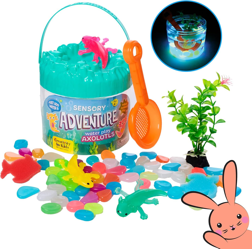 • SPLASH INTO AXOLOTL FUN: Dive into a glowing underwater adventure with the Sensory Adventure Axolotls Kit! This exciting set includes stretchy axolotl toys, glow-in-the-dark stones, sponge animals, and an underwater plant—everything kids need to build an axolotl lagoon. Great for ages 4+, it encourages creativity, sensory exploration, and pretend play toys, making it a popular choice for axolotl gifts
