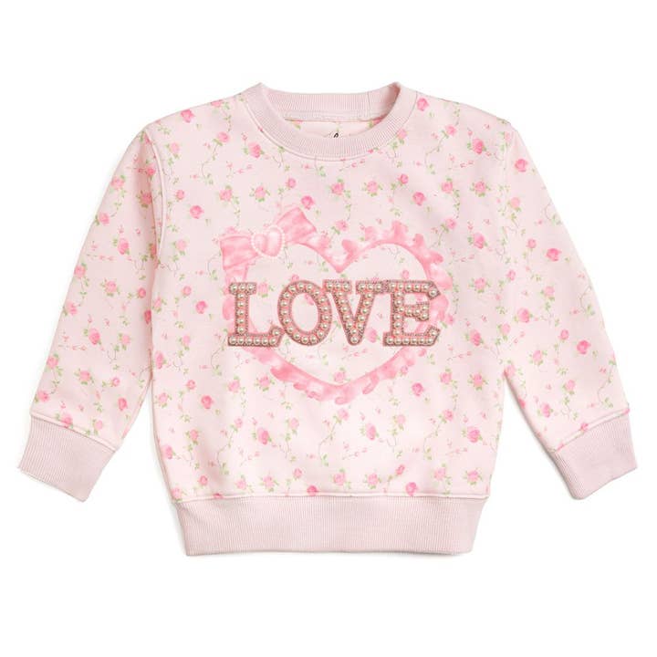 This adorable pink floral sweatshirt features a sparkling “LOVE” patch framed by a satin heart and bow, adding the perfect touch of sweetness to any cozy outfit. Features: *Crewneck Color: Pink *Patch Color: Shiny pearls with silver rhinestones and a pink outline *Material: 60% Cotton/40% Polyester *Features: Tagless inside neck label for an itch-free wear *Fit: Toddler Unisex; True to Size *Care: Machine wash cold inside out, only non-chlorine bleach, tumble dry low, do not iron on decoration, do not dry clean Each sweatshirt is hand pressed with love in our hometown warehouse.