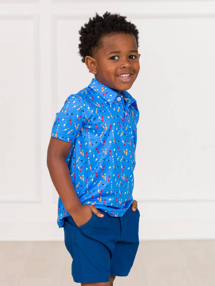 He can dress just like dad with this Knit Short Sleeve Performance Polo. Made with stretch material, this polo is perfect for the active little guy. The fun and whimsical crayon print is perfect for school days or any little one who loves to color! Goes perfectly with Dark Navy, Red, Green, and Bright Aqua. Care Instructions: Machine wash cold; only non-chlorine bleach when needed; tumble dry low Fabric Content: 90% Polyester, 10% Spandex