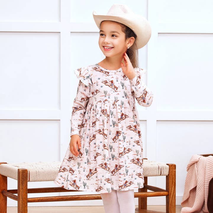 This charming cowgirl dress blends everyday comfort with frontier flair. Featuring a playful Western print, lace-edged shoulder ruffles, and long sleeves, it's made from an ultra-soft bamboo, cotton, and spandex blend that’s eco-friendly and hypoallergenic. Back buttons make changes a breeze—perfect for every little wrangler with a wild side.