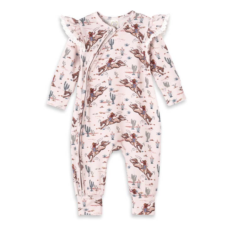 This super soft baby girls' zipper romper, made from a bamboo/cotton/spandex blend, features a charming western-inspired cowgirl print and a handy zipper for quick changes, complete with a neck guard for added protection. Adorable neck and zipper ruffles bring extra flair. Cozy, absorbent, hypoallergenic, and eco-friendly, she'll be ranch-ready in no time! Easy care-machine wash warm and tumble dry low.