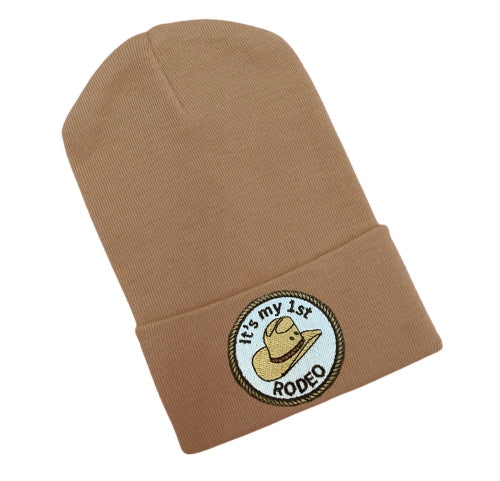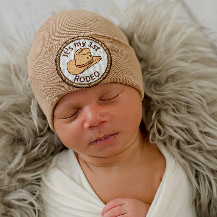 Celebrate your little cowboy's arrival with our adorable, tan or white-colored newborn hospital hat, proudly made in the USA! Featuring the charming phrase "It's my 1st Rodeo" alongside a whimsical cowboy hat design, this hat is perfect for those precious first photos. Crafted from soft, breathable fabric, it ensures comfort for your newborn while adding a touch of fun to their outfit. Ideal for baby showers, gift giving, or simply capturing those unforgettable moments, this hat is a must-have for every cowboy-themed nursery. Make your baby's debut memorable with this delightful hat—perfect for the little one who's ready to take on the world, one rodeo at a time!