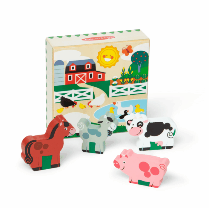- Melissa & Doug Animal Matching Play Set includes 4 play figures: cow, pig, horse, and goat, and a wooden tray for matching, storage, and for use as a background scene for pretend play