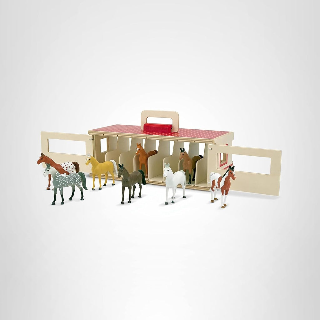• 8 toy horses stored in a wooden take-along stable for galloping good times