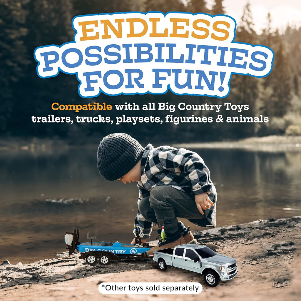• Realistic Kids Fishing Toy: Big Country Toys fishing playset is a realistic kids fishing set with lots of moving parts to explore! Perfect for replicating a true bass authentic fishing theme, this playset has many moving parts. Throw out the line, reel in fish, store them in the live well, lower the bass boat trolling motor, swivel the chair, and dismount the boat from the trailer.