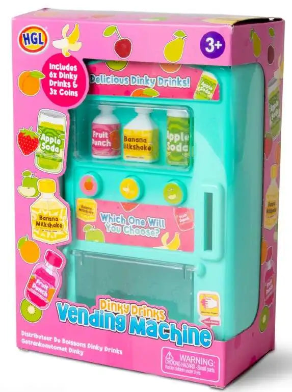 - Includes 6 pretend Dinky Drinks and coins for interactive vending experience.