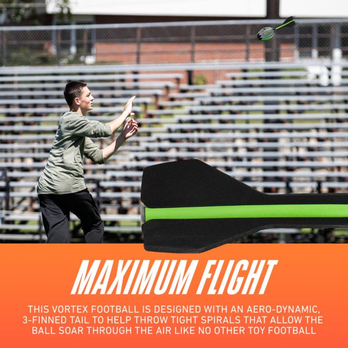 - MAXIMUM FLIGHT: This Vortex football is designed with an aero-dynamic, 3-finned tail to help throw tight spirals that allow the ball soar through the air like no other toy football