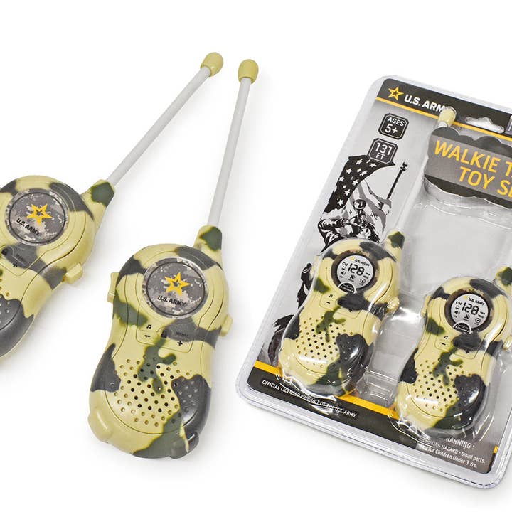 - Stay connected on your outdoor adventures with the US Army 2 Pc Walkie Talkie Set.