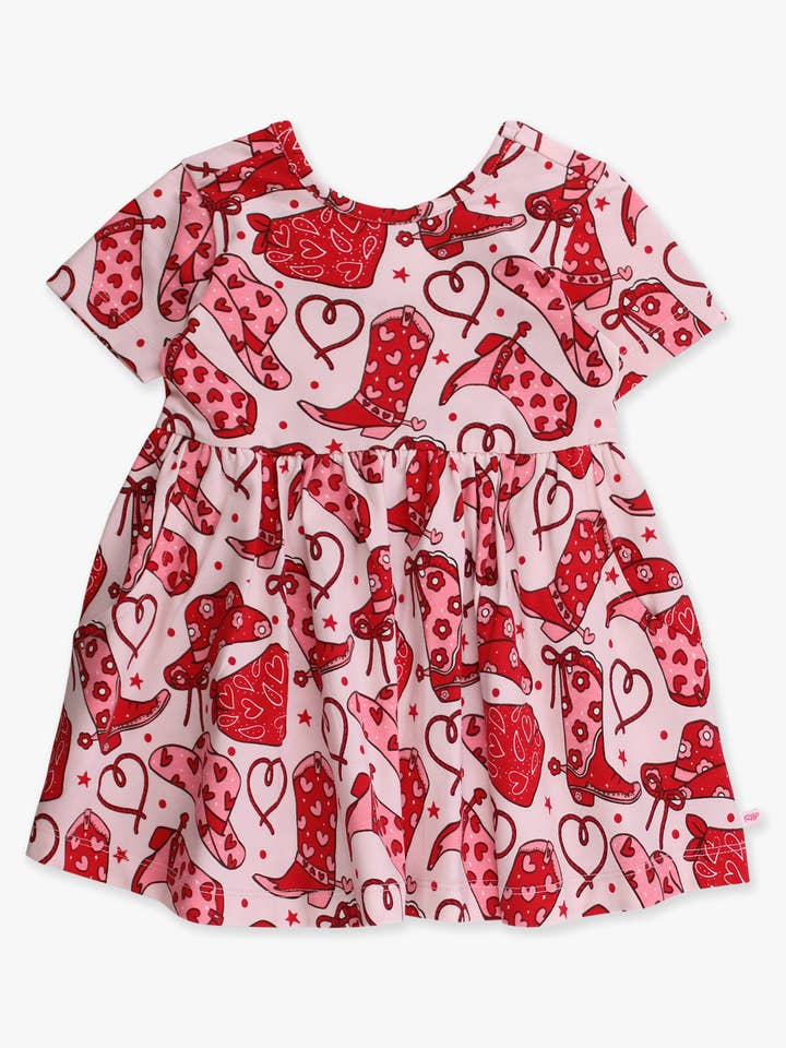 Our bestselling short sleeve twirl dress is a must-have addition to any little girl's wardrobe. Crafted from high quality knit fabric, this dress is gentle on skin, ensuring a comfortable fit and easy wear. Functional pockets make it practical, and a sweet bow accent on the back adds the perfect girly touch! Wear alone during warm weather or layer with a cozy cardigan during the colder months. Yeehaw! Giddy up and get ready for Valentine's Day with this festive western print! Pairs well with Red, Bubblegum Pink, White. Care Instructions: Machine wash cold; only non-chlorine bleach when needed; tumble dry low Fabric Content: 95% Cotton, 5% Spandex