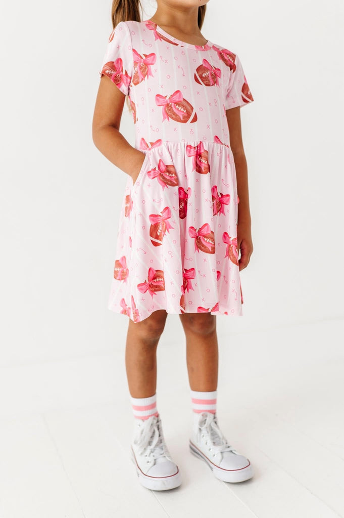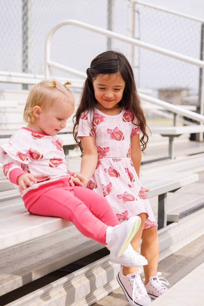 This football-themed twirl dress is made for your little MVPs who love a touch of sparkle with their sports! Featuring an all-over print of pink-bowed footballs and playful playbook icons, it's the perfect mix of sporty and sweet. The bow detail on the back adds extra charm, while the layered ruffle hem brings major twirl power. Crafted from our ultra-soft bamboo blend, it’s breathable, stretchy, and comfy enough for touchdowns, tailgates, and twirls.