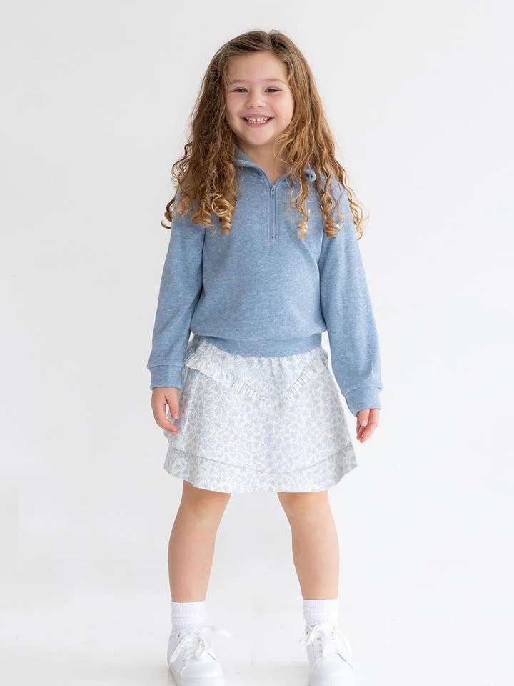 This girl's two piece set features a cozy, long-sleeve pullover in a soft blue hue with a half-zip front for easy wear. Paired with a charming floral skirt in matching blue and white tones, this set combines comfort and style. The skirt showcases tiered ruffles, adding a playful, girly touch to the outfit. Perfect for versatile, everyday wear