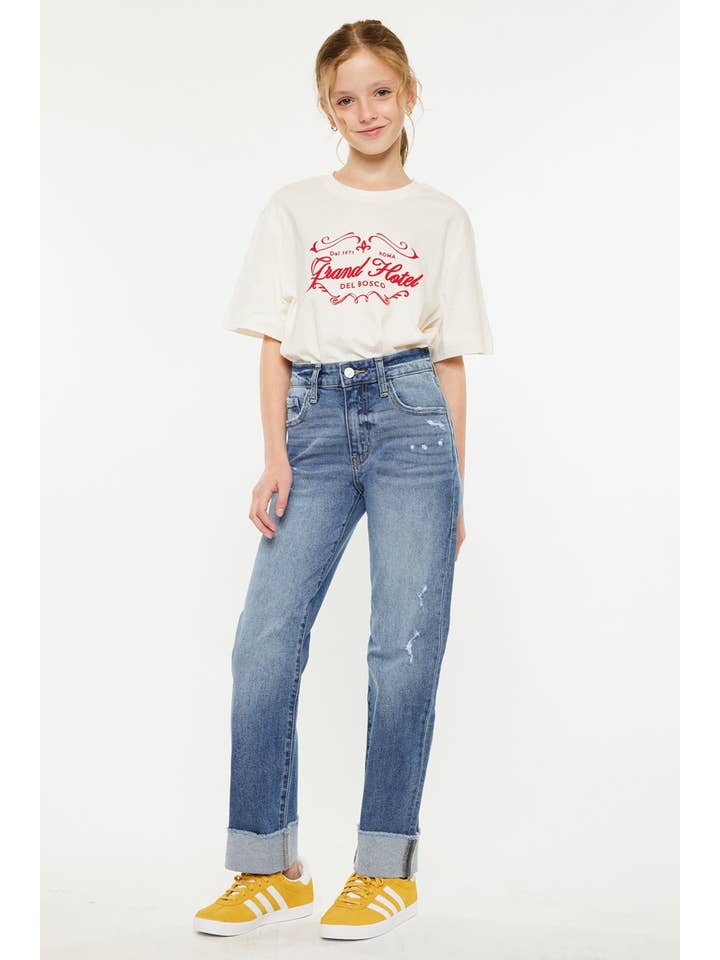 Straight leg 2 1/2" single cuff hem Zipper fly Rise 9 1/2" inseam 25 1/2"(w/cuff) in size 10 99% cotton, 1% spandex