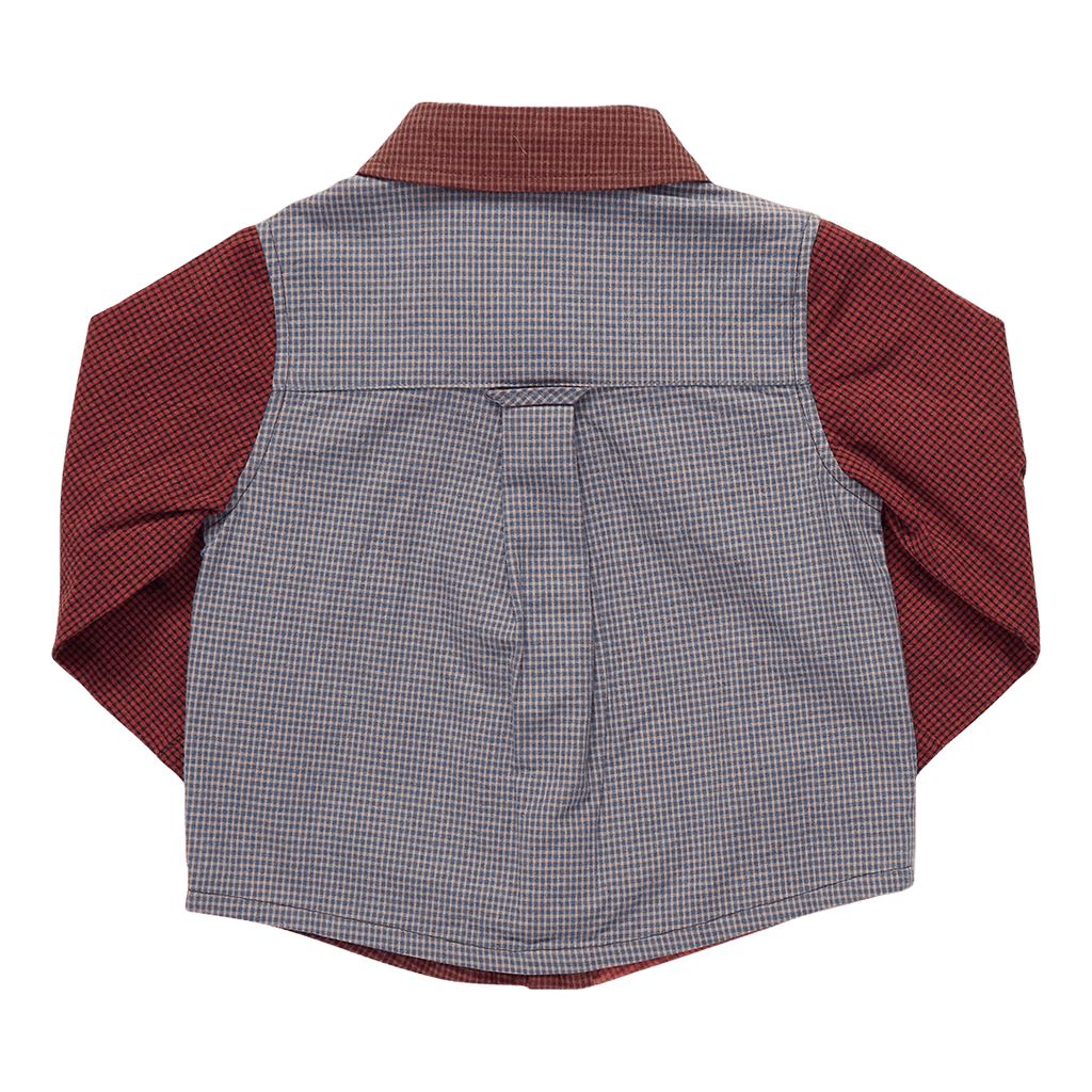 All Mixed Up! Color blocked ginghams in pumpkin, rust and cranberry fall together in our collection classic Boys Jack Shirt shown here in Mixed Checks. Long sleeves, pattern on pattern chest pockets and faux horn buttons up the front define this wear anywhere wardrobe staple. Pair with our Boys Jackson Pant for a buttoned up fit, that moves seamlessly from a backyard game of tag to Sunday lunch with the grandparents