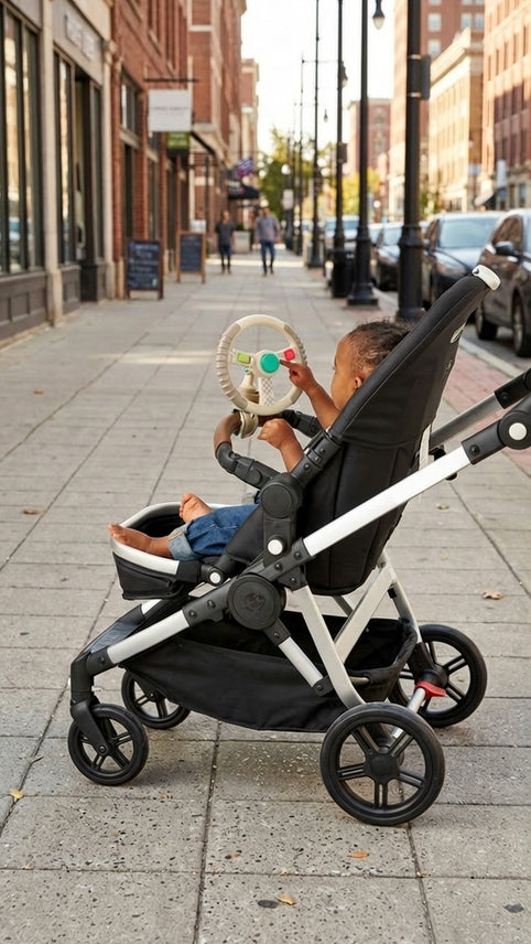 Features - Travel = playtime with this spinning steering wheel made for little racers - Three built-in fidgets keep baby busy while you do you - Adjustable clip fits most strollers, wagons and shopping carts. Versatile and adorable.