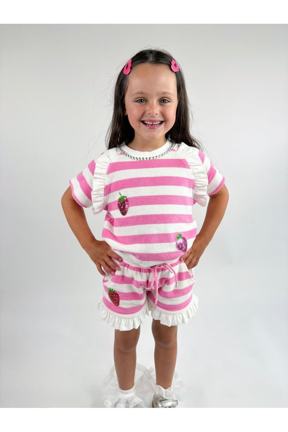 Sweet, comfy, and made for sunshine days — our Strawberry Stripe Ruffle Set is the perfect blend of playful charm and everyday wearability. Designed in our signature soft terry fabric, this two-piece girls set features pink and white stripes with the cutest strawberry appliqué details for a fun pop of whimsy. The short-sleeve top is finished with feminine ruffle accents along the shoulders and a delicate crystal neckline detail for just the right amount of sparkle. The coordinating shorts feature a soft elastic waistband with a decorative, non-adjustable drawstring, ruffled hem, and matching strawberry appliqué for an effortlessly cute, put-together look. Perfect for spring and summer outings, playdates, vacations, and everything in between — this set is comfy enough for all-day wear while still feeling extra special. ✨ 𝐃𝐞𝐭𝐚𝐢𝐥𝐬: • Two-piece girls set: short-sleeve top + ruffle shorts • Soft terry fabric for breathable, all-day comfort • Pink & white striped design • Strawberry appliqué details on top and shorts • Ruffle accents on sleeves and shorts • Elastic waistband with non-adjustable drawstring • True to size