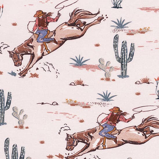Saddle up for cuteness! This darling skirted bodysuit features a playful Wild West print and sweet lace-edged shoulder ruffles for extra flair. Made from a buttery-soft bamboo/cotton/spandex blend, it's eco-friendly, hypoallergenic, and perfect for your little cowgirl’s everyday adventures. Finished with buttons at the back of the neck and snaps underneath for easy changes.