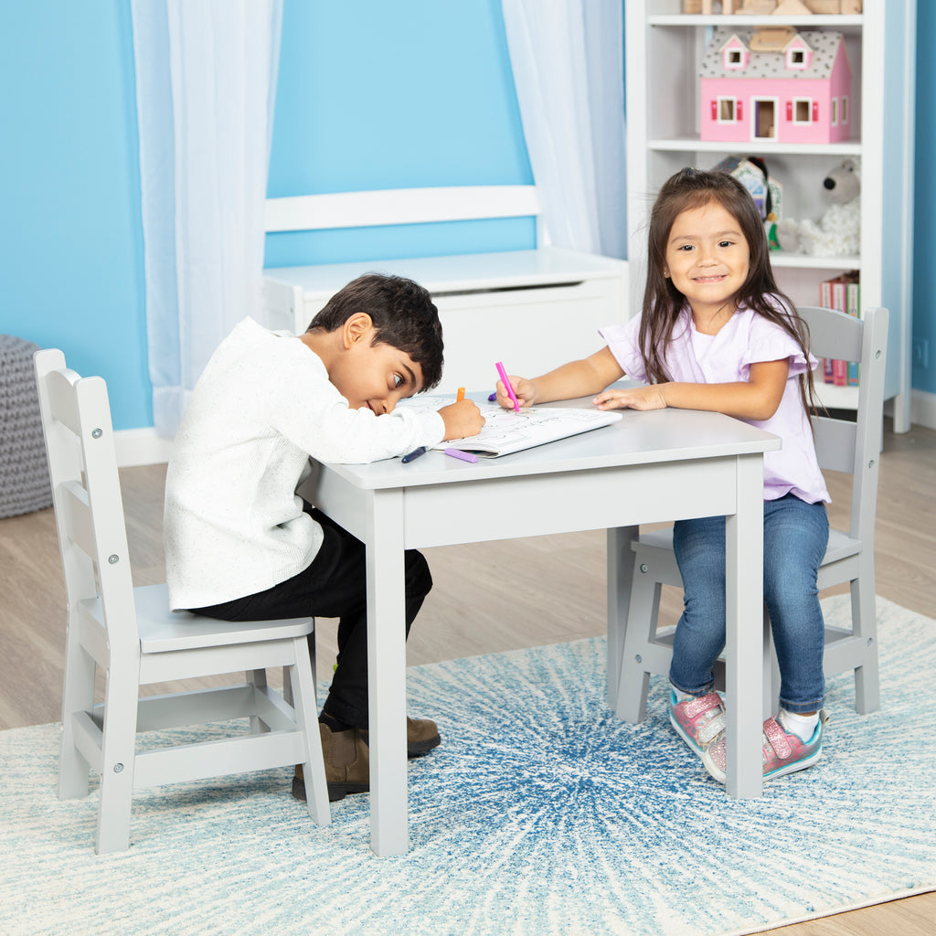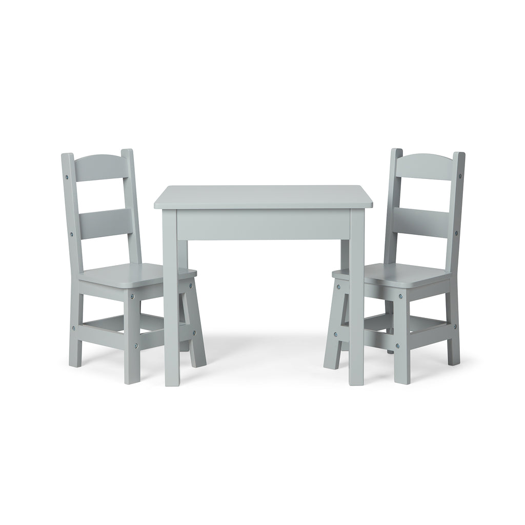 • Easy-to-assemble sturdy wooden table and 2 wooden chairs in gray, sized for kids