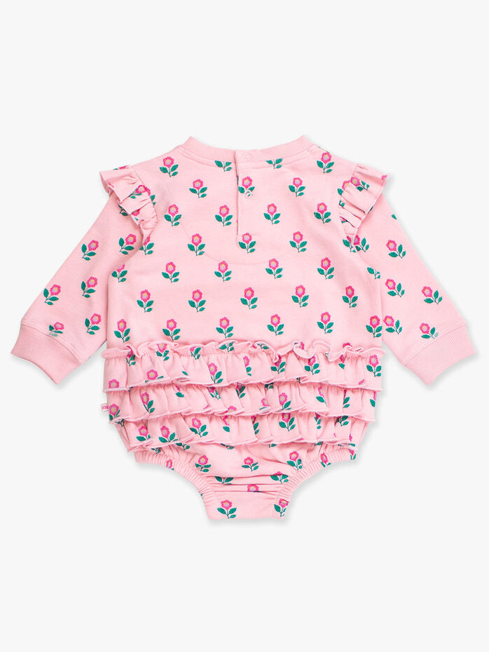 Bright and cheerful, the Rufflebutts Zinnia Meadow Sweatshirt Bubble Romper is a cozy one-piece bursting with floral charm. Perfect for playtime, outings, and all-day cuteness.